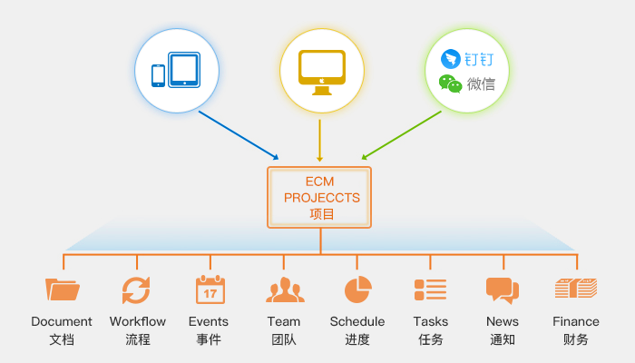 將項(xiàng)目所有關(guān)聯(lián)流程串接在一起,是項(xiàng)目操作規(guī)范化和標(biāo)準(zhǔn)化,也便于集中查詢監(jiān)控和分析,可通過兩種方法發(fā)起項(xiàng)目流程,直接從項(xiàng)目中發(fā)起流程,或者在流程表單中選擇項(xiàng)目