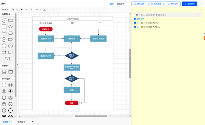 流程建模及編制模塊新增了流程圖繪制規(guī)范檢查功能。在繪制流程圖時(shí),根據(jù)流程圖規(guī)范進(jìn)行自動(dòng)檢查,包括連線檢查、空值檢查、循環(huán)檢查等,當(dāng)發(fā)布時(shí)不符合規(guī)范流程圖進(jìn)行提醒提示。讓流程圖真正實(shí)現(xiàn)一鍵發(fā)布。同時(shí)針對(duì)流程版本還完善了以下三大功能: