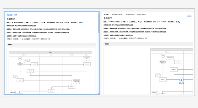 ● 流程版本迭代功能:設(shè)計(jì)中的流程,可以查看歷史發(fā)布版本,在同一個(gè)頁(yè)面里左右分屏查看當(dāng)前版本和歷史版本。